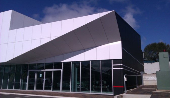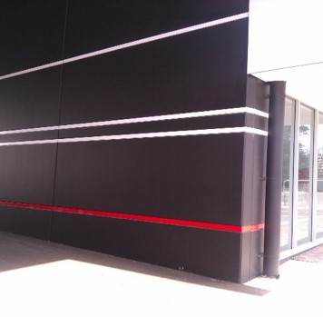 We like our buildings to support ideas external to the normal self- referencing in architecture. These two motor workshop buildings were conceived – and approved – as having black walls, with white and red stripes. The ‘external’ idea was the experience of driving at night: the white and red stripes referring to edge-of-road marker posts, and the long tapering white fascias headlight beams.